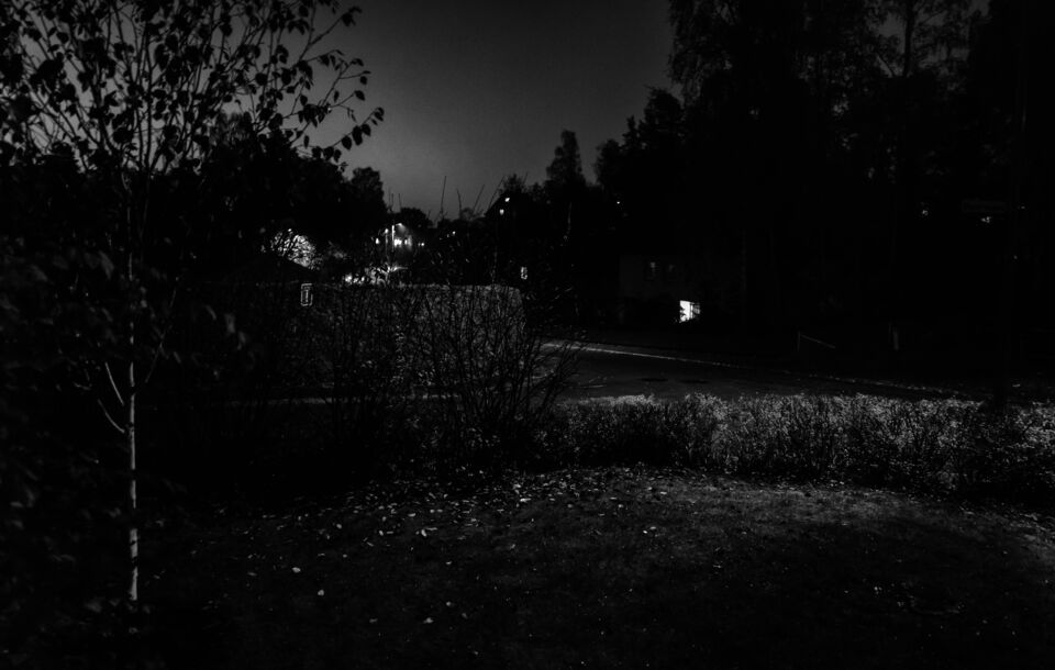 Straxt innan jag drar ner rullgardinen och går och lägger mig tittar jag ut genom fönstret. Molnen står lågt, ovanligt ljust över centrum som inte är så stort.