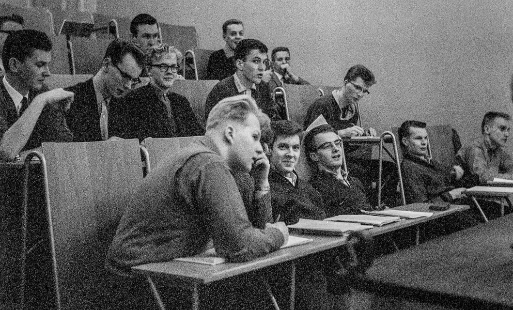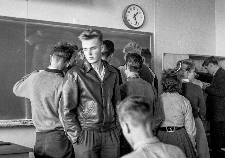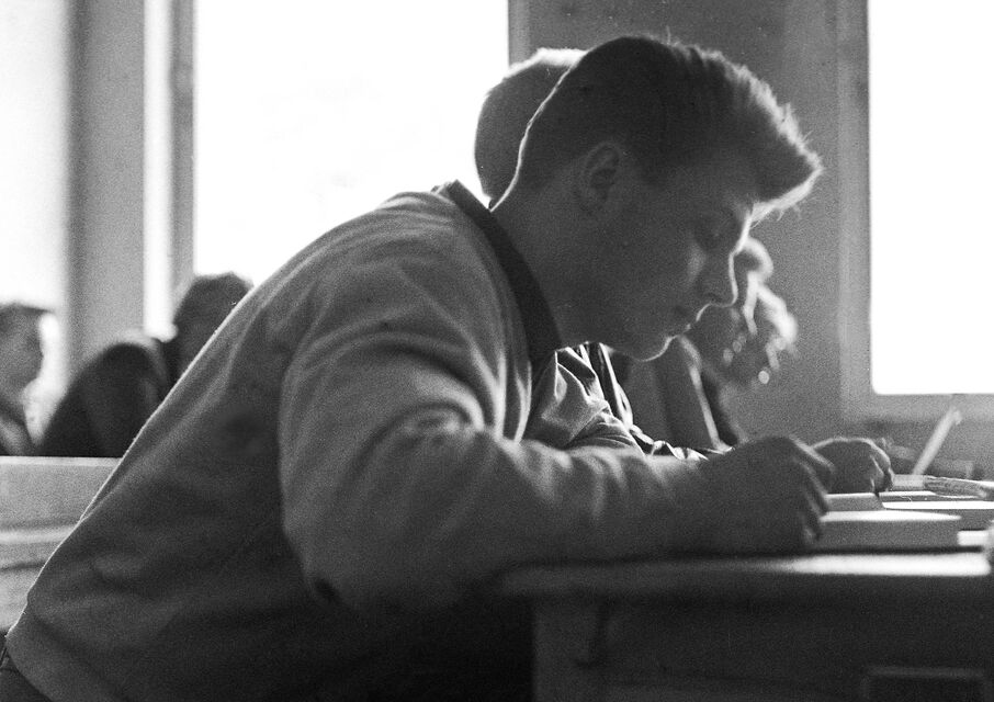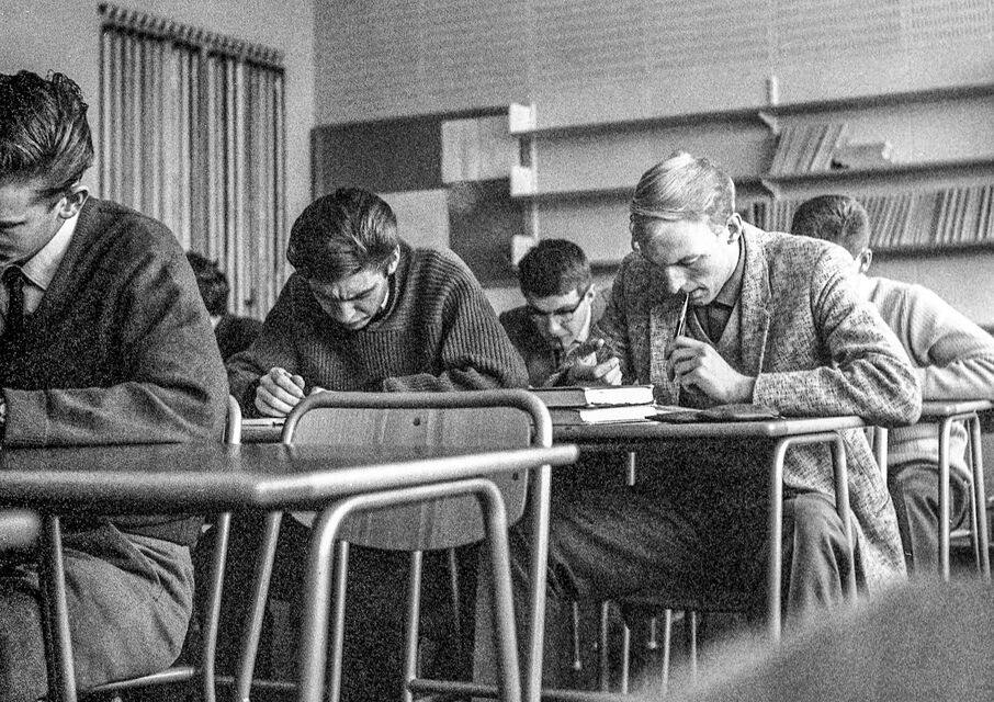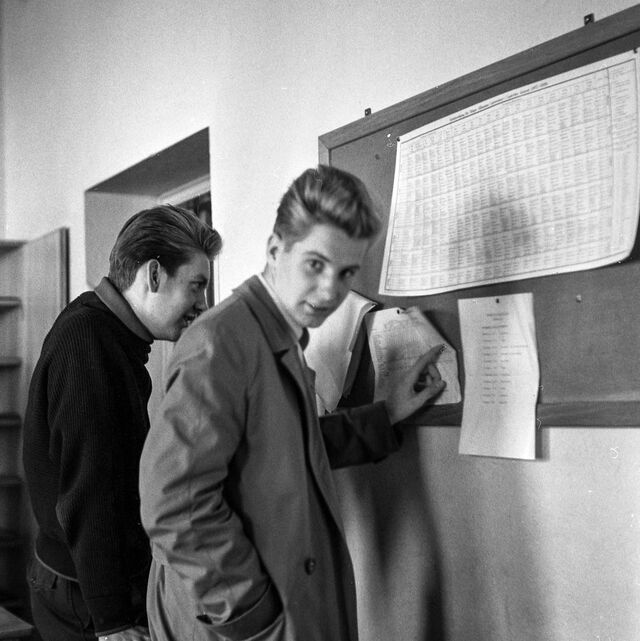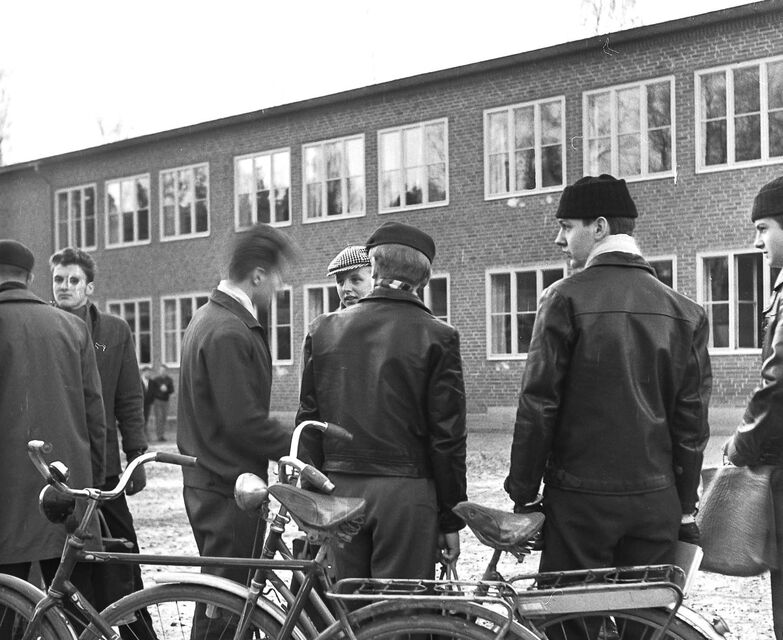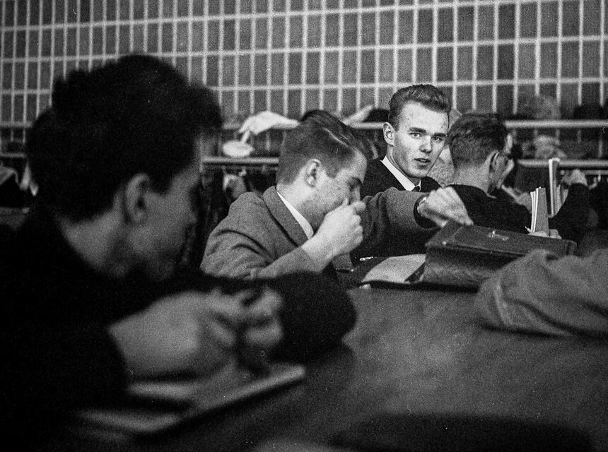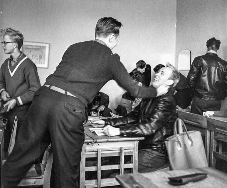 Bilder tagna i skolan under gymnasietiden 1957-1959, Ludvika. Också här är det helt autentiska bilder utan några som helst förberedelser. Bilderna är både från lektioner, från raster, från kapphallen och ja, från skolans värld helt enkelt. Bilderna i den här serien är tagna med min japanska "Rolleiflex", Yashica-Mat, alltså format 6x6.