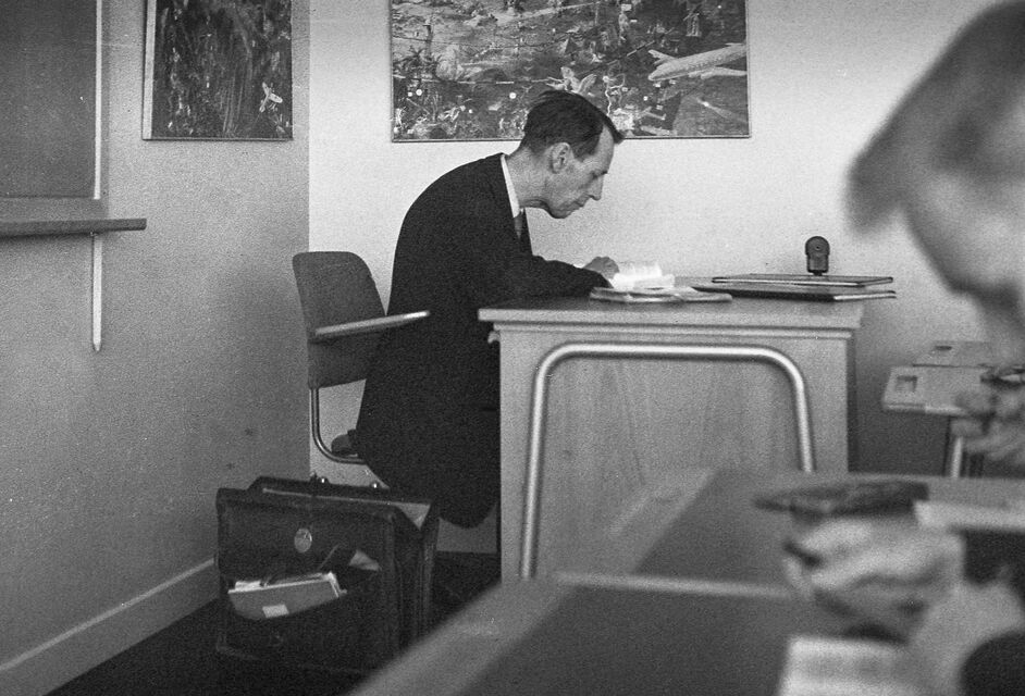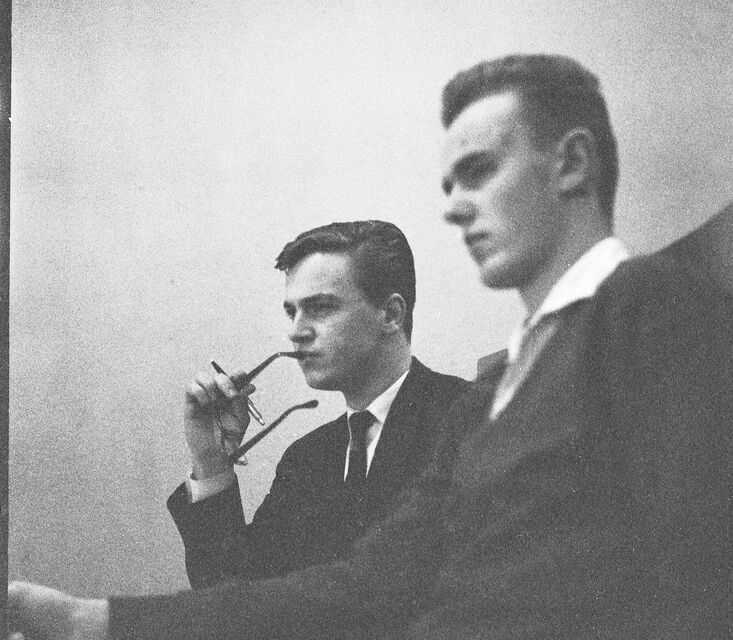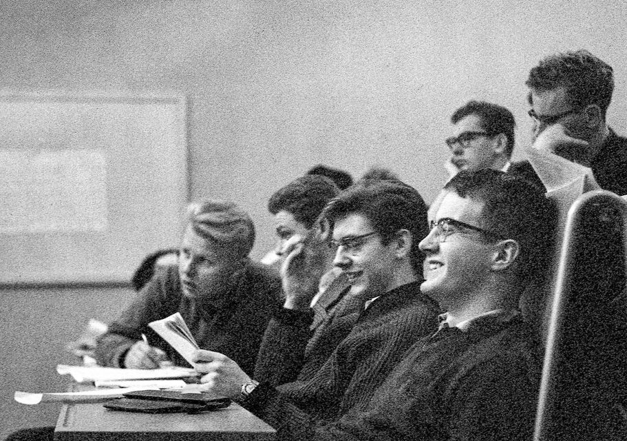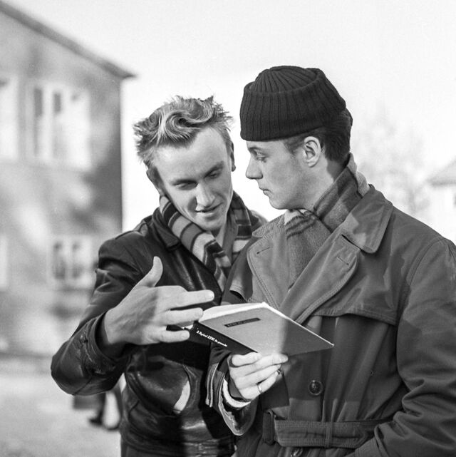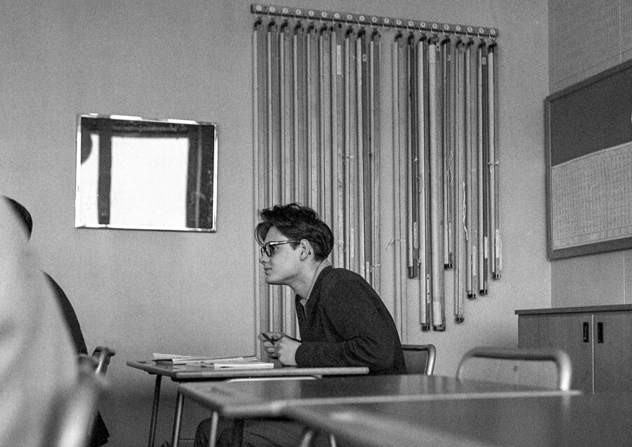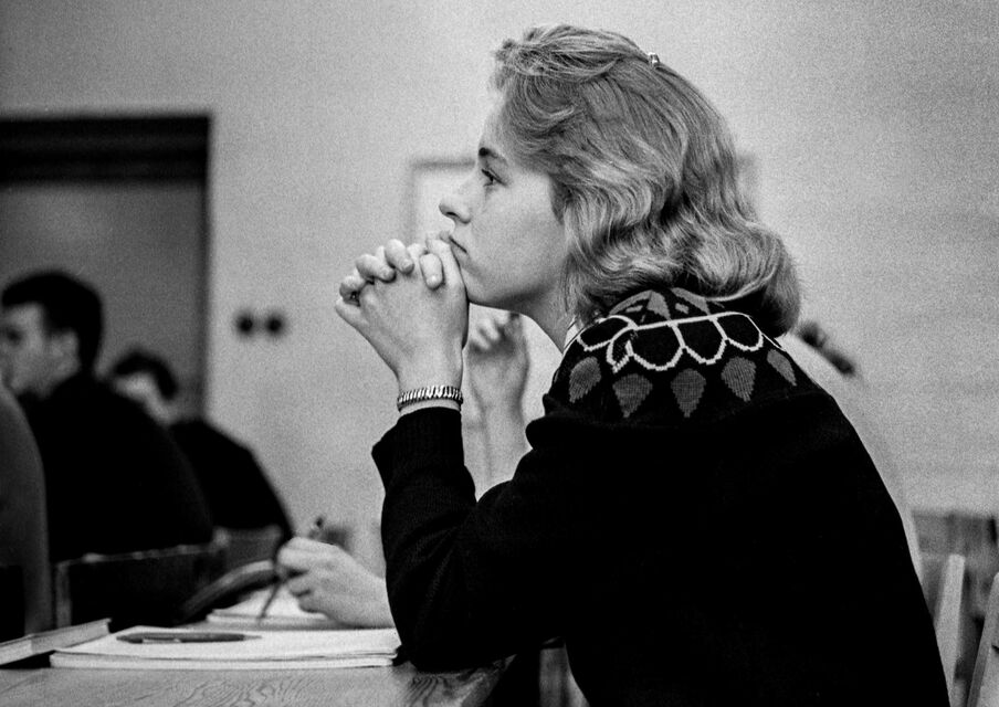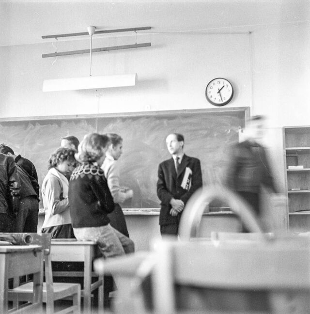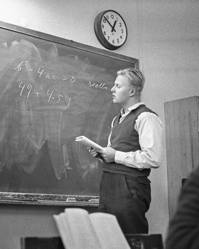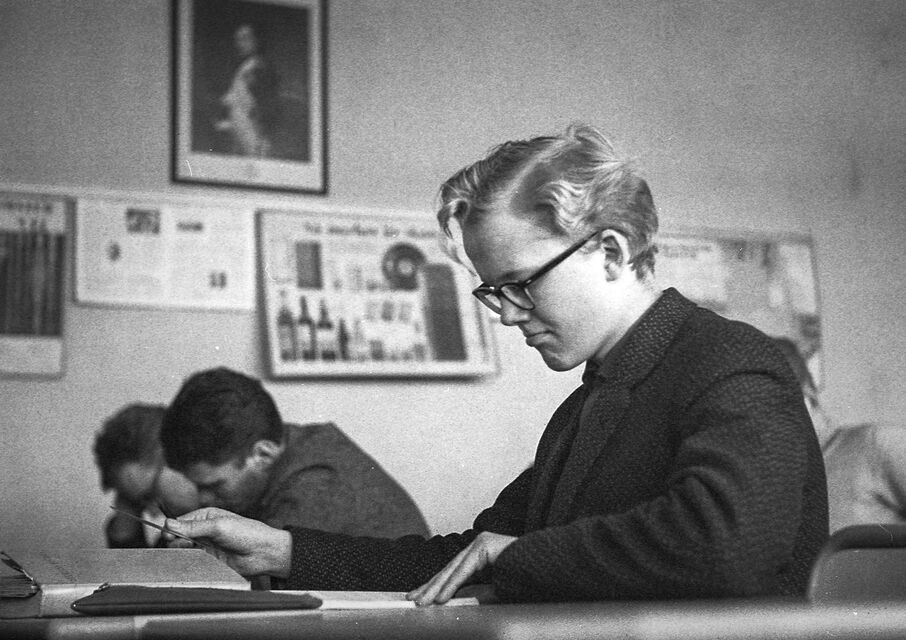 Bilder tagna i skolan under gymnasietiden 1957-1959, Ludvika. Också här är det helt autentiska bilder utan några som helst förberedelser. Bilderna är både från lektioner, från raster, från kapphallen och ja, från skolans värld helt enkelt. Bilderna i den här serien är tagna med min japanska "Rolleiflex", Yashica-Mat, alltså format 6x6.